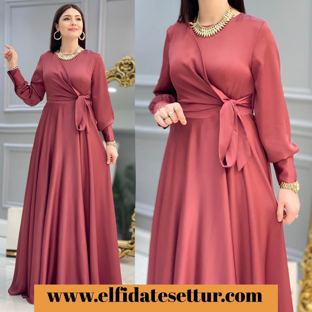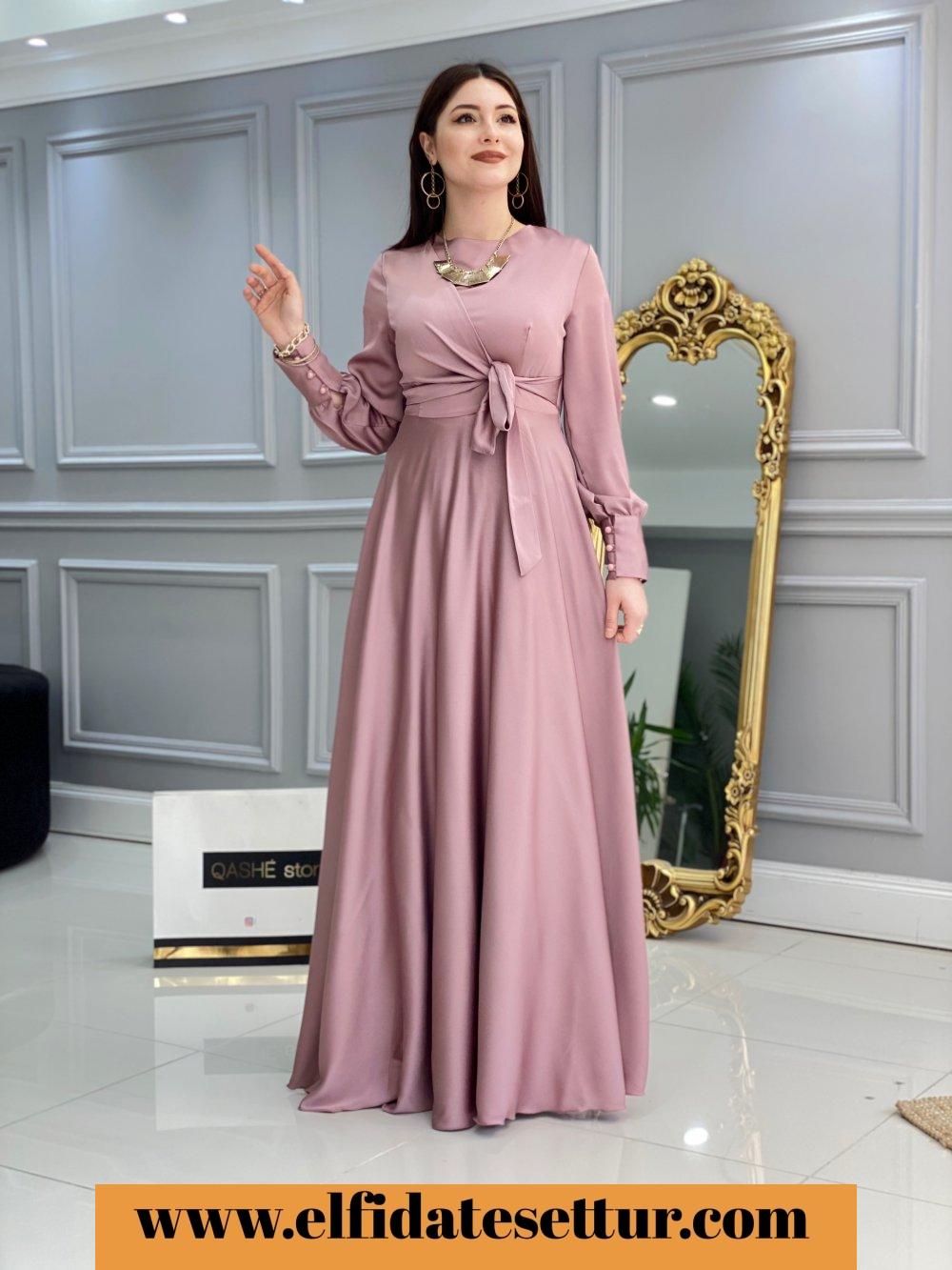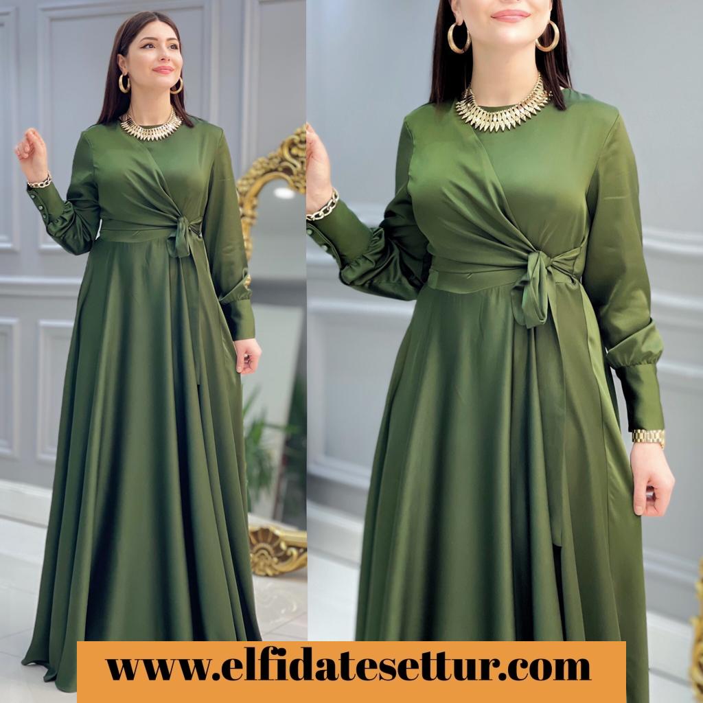 Ürün bilgileri: 1. Sınıf İthal Saten kumaştır.Elbisenin sol alt kısmında bağlama detayı vardır. Elbisenin etek kısmı mevlana kesimdir.Kol uçları manşet düğmelidir. Arkadan fermuarlıdır.