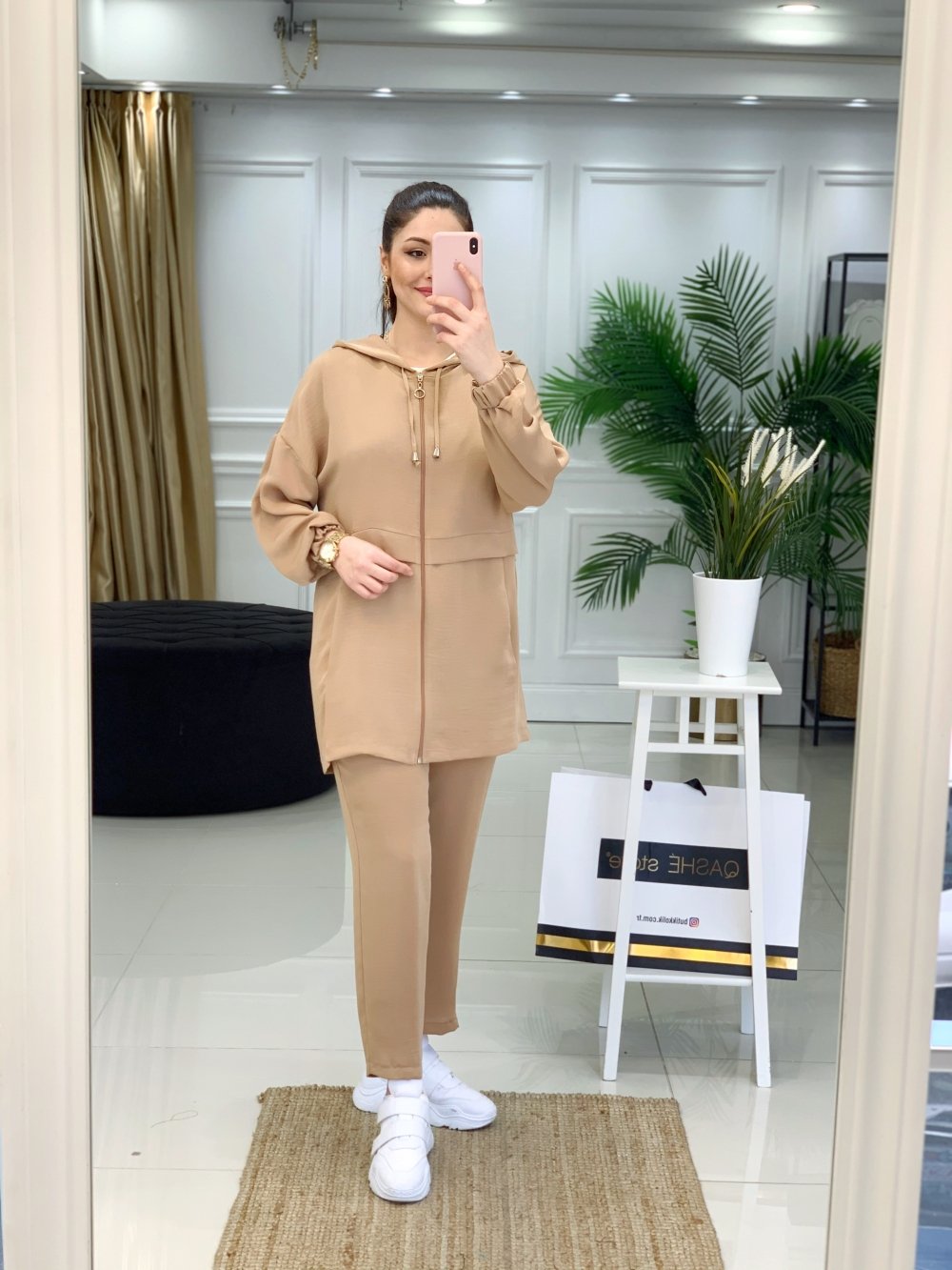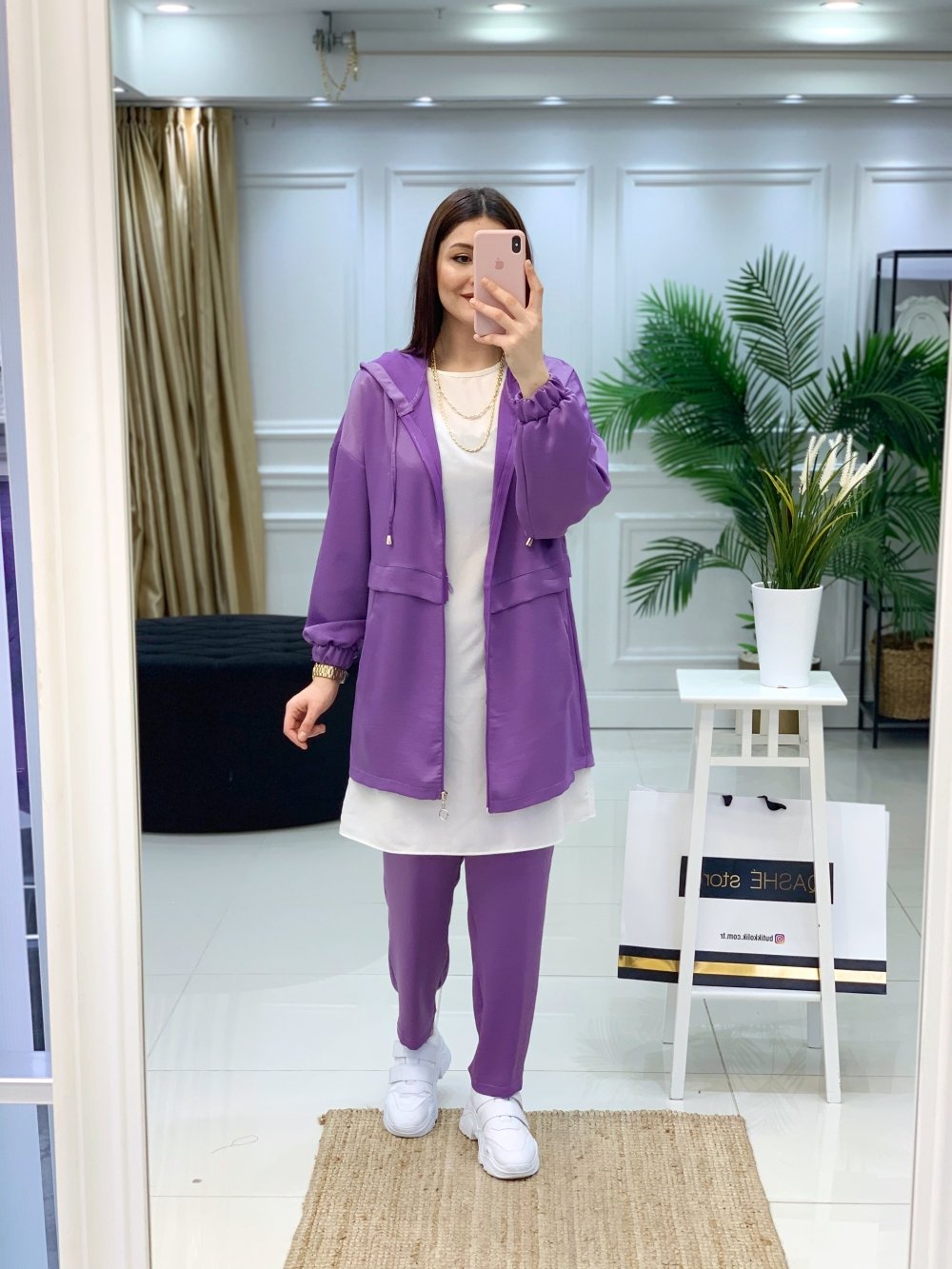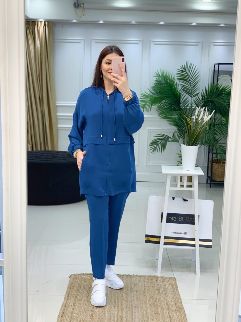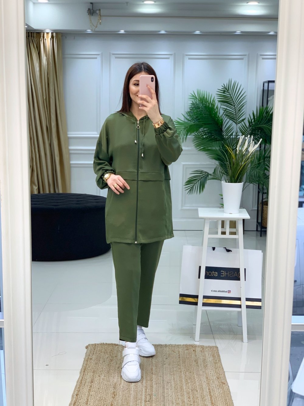 Beden Aralığı: 36-38-40-42 Salaş kesimdir. Ürün Detayı: 1.sınıf saten aerobin kumaştır. Üst boydan fermuarlıdır ve kapüşonludur. Yandan cepleri vardır. Pantolonun beli lastiklidir. Hırka Boy: 80 cm Göğüs: 120 cm Bel: 106 cm Basen: 114 cm Pantolon Boy: 95 cm