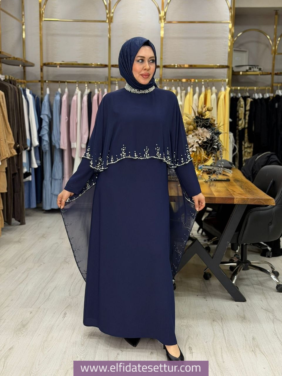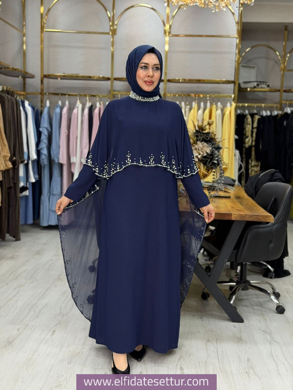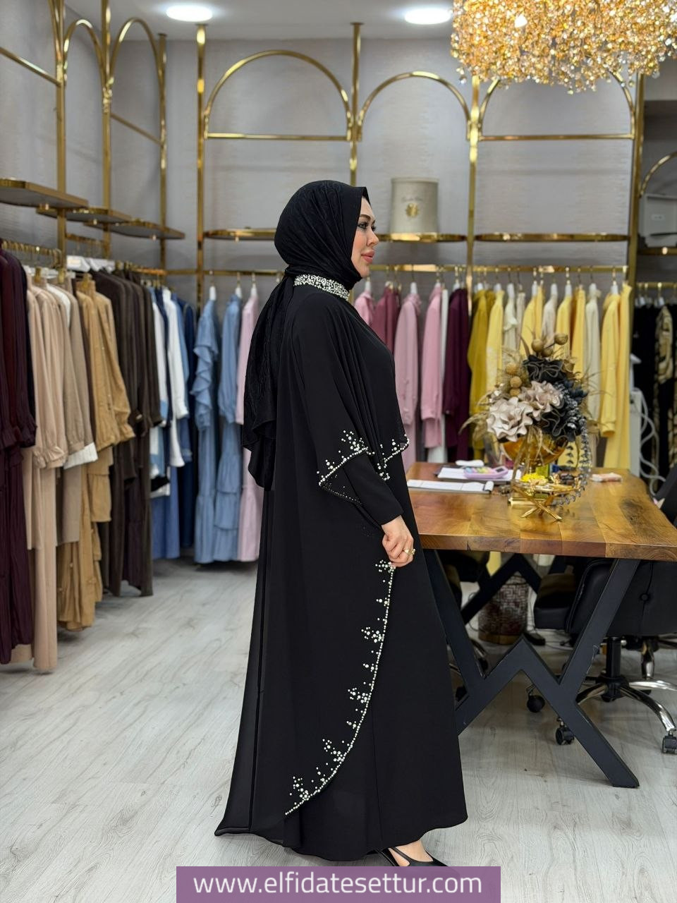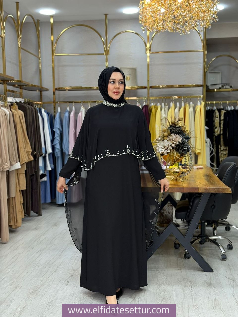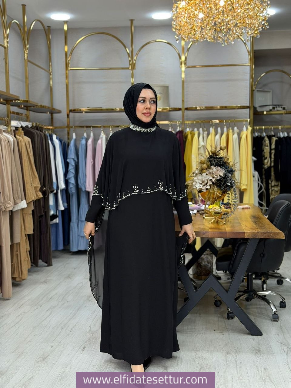 Kumaşı kreptir. Üzerindeki şifon çıkarılabilir. Taşları çakmadır.