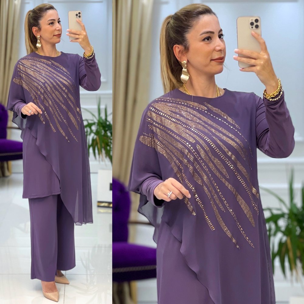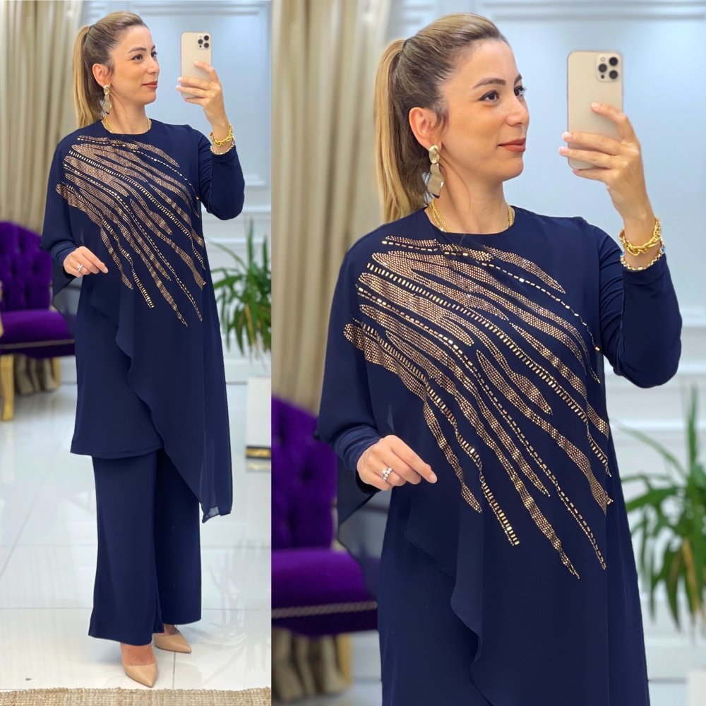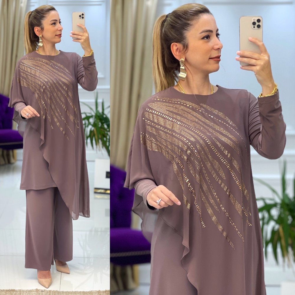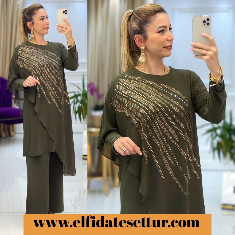 1. Sınıf Üst Parçası Şifon İç Kısmı Sandy Kumaştır. 40 Beden Ölçüsü: Tunik İç Boy : 95 cm Tunik Diş Boy : 115 cm Göğüs:106 cm Omuz: 46 cm Pantolon boy: 100 cm Pantolon ve iç tunik ital sandy kumaş diş pelerini şifon kumaştır Göğüs kısmı taş detaylıdır