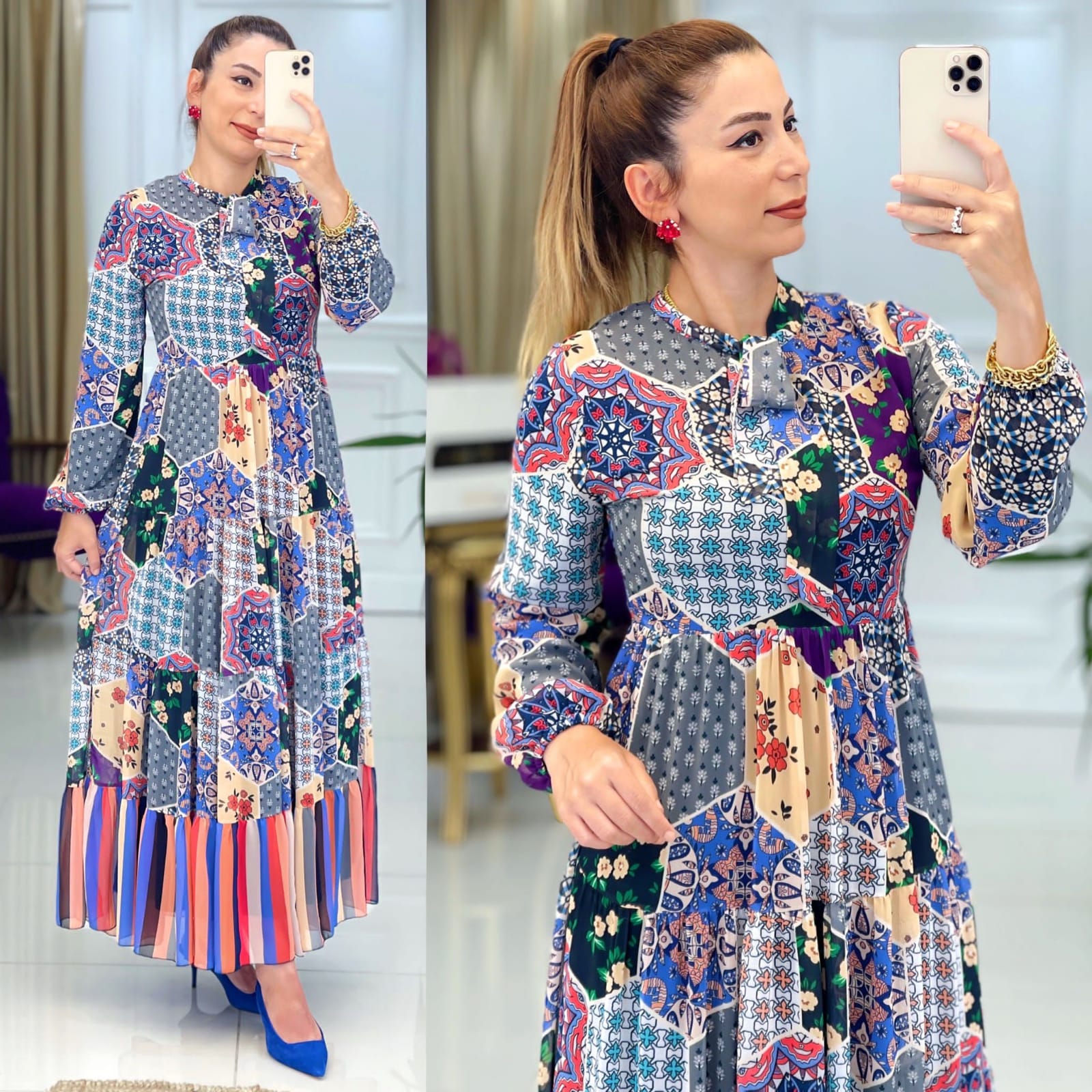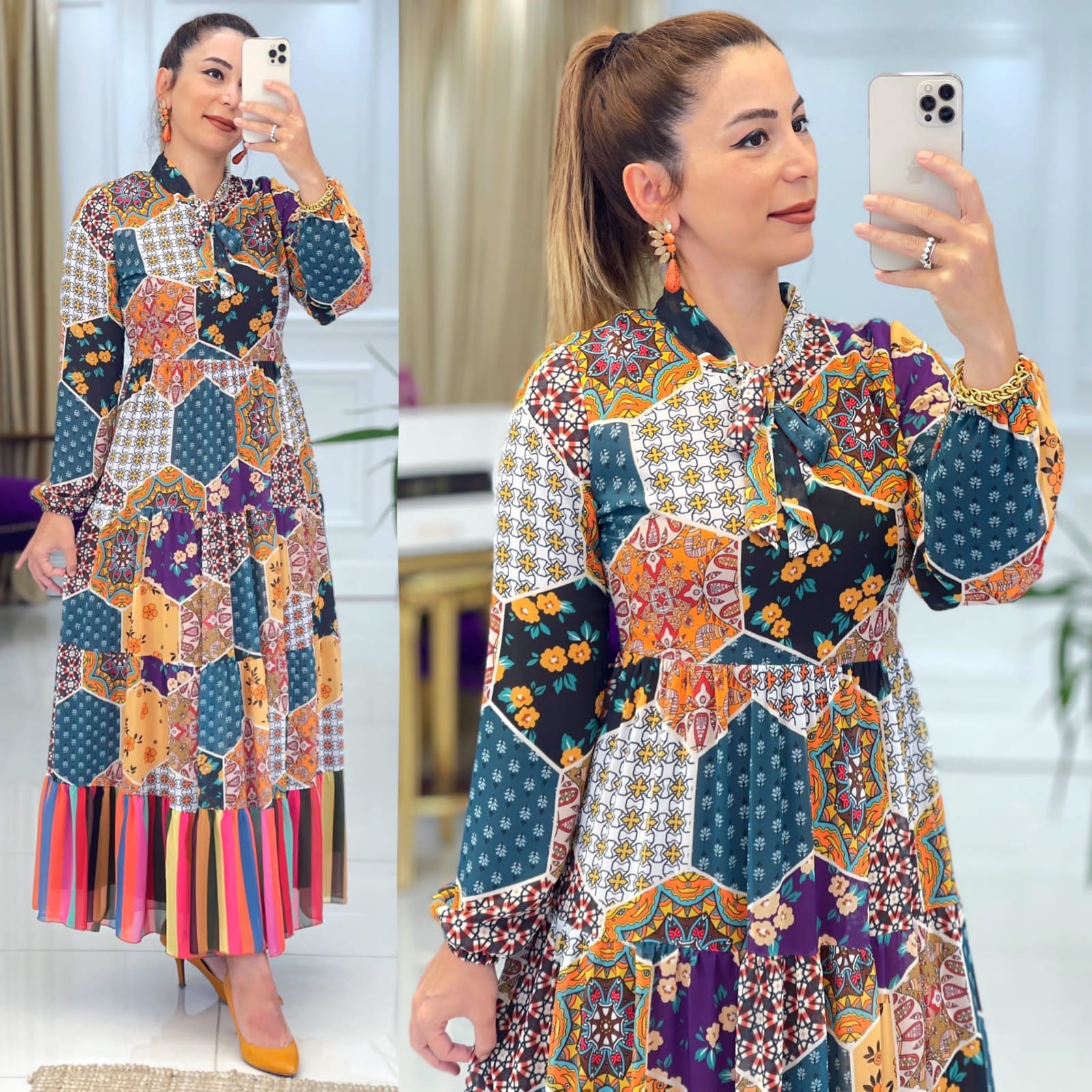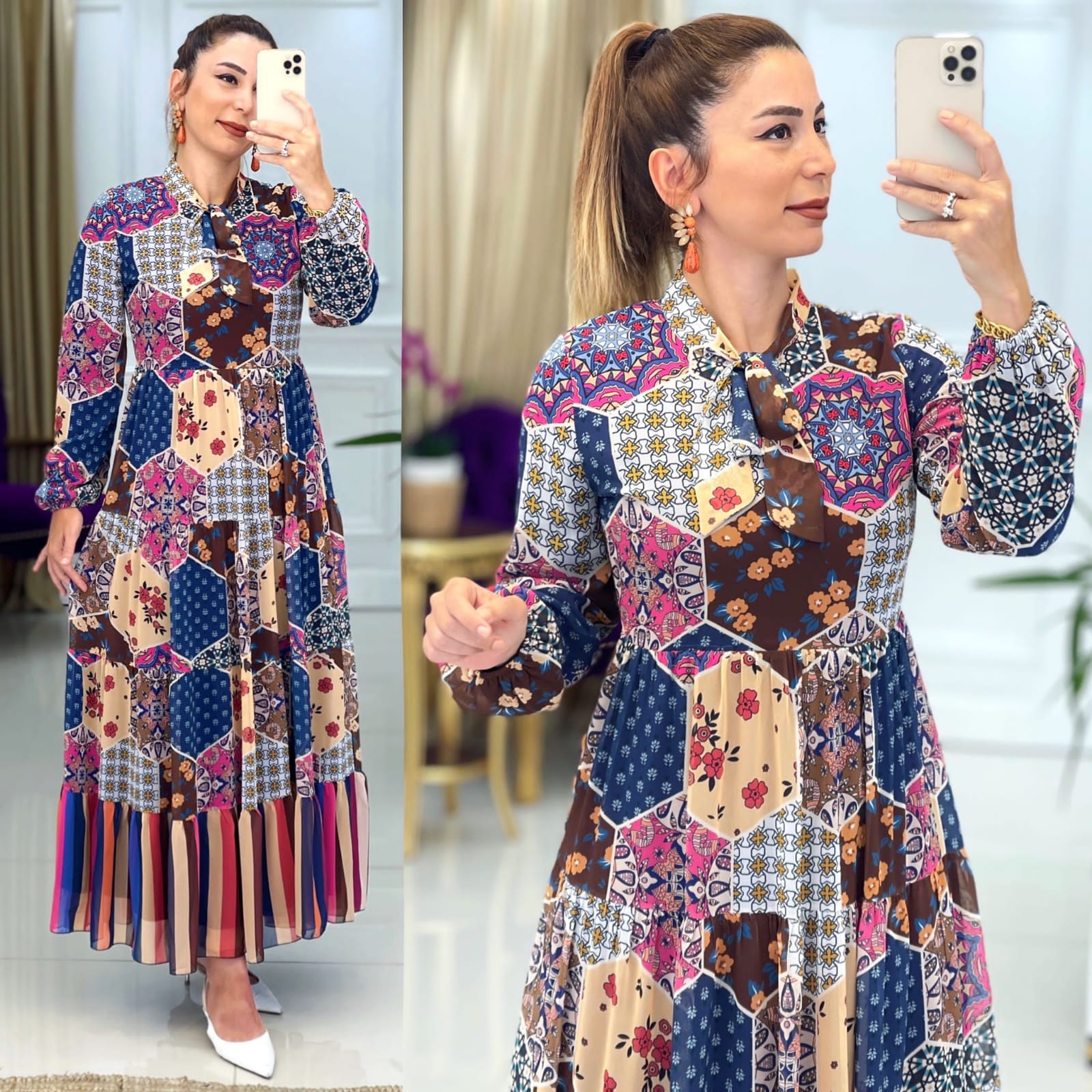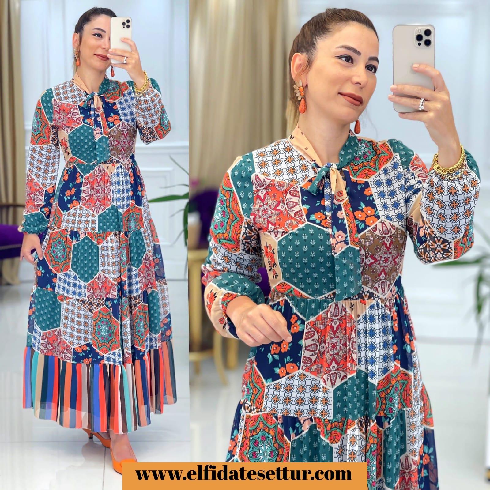 Ürün bilgileri: Birinci Sınıf Baskılı Şifon kumaştır. Elbise yaka kısmı fular detaylıdır.