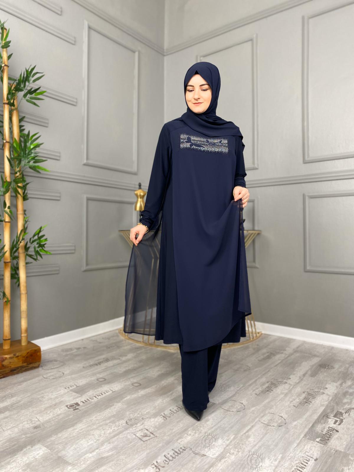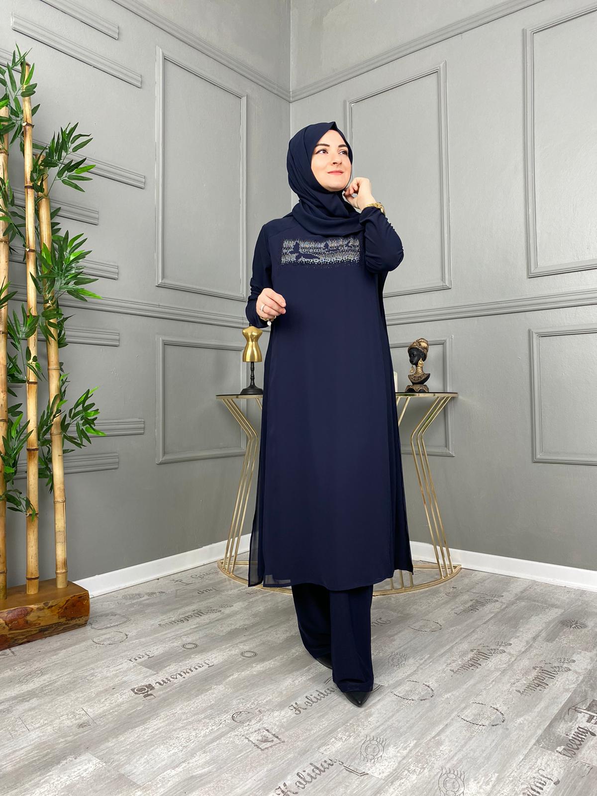 Kelebek desen işlemeli Şifon detaylı pantolonlu takımımız