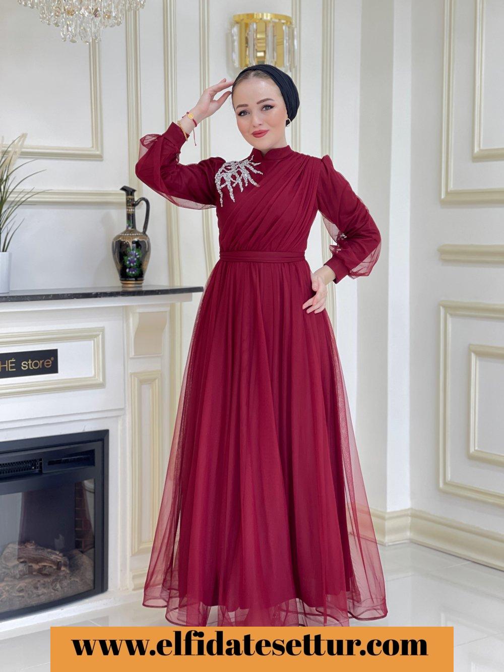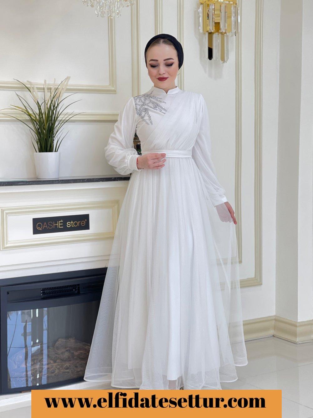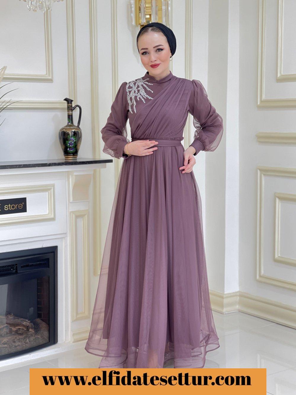 1.Kalite Tül Kumaştır. 38 Beden Ölçüsü: Elbise Boy:155 Göğüs: 100 Omuz: 38 Bel: 40 cm Elbise tek omuzdan işleme detaylıdır. Elbise seyyar kemerlidir.