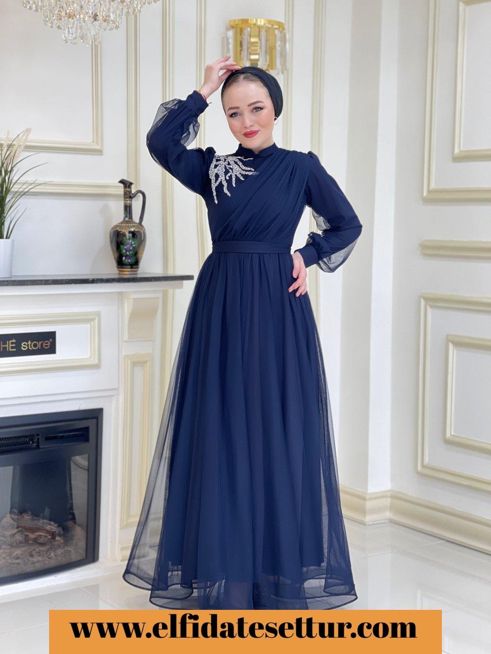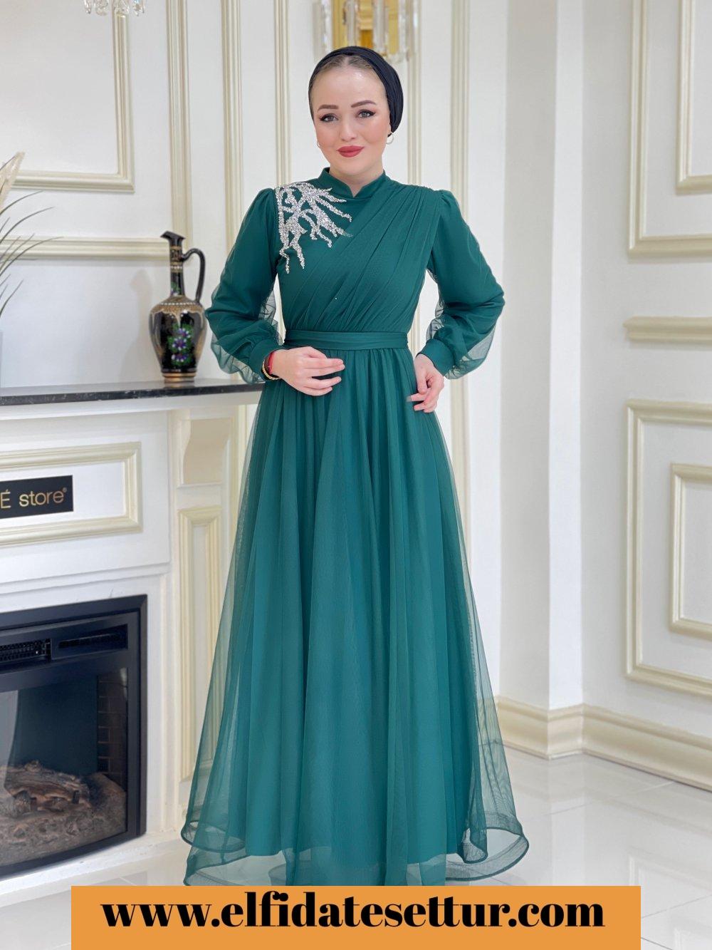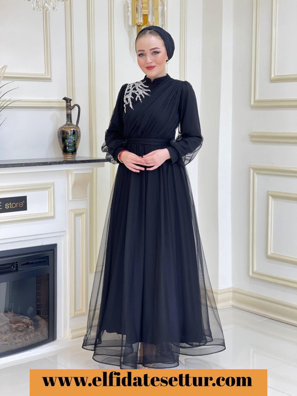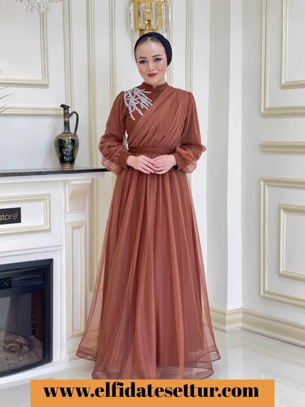 1.Kalite Tül Kumaştır. 38 Beden Ölçüsü: Elbise Boy:155 Göğüs: 100 Omuz: 38 Bel: 40 cm Elbise tek omuzdan işleme detaylıdır. Elbise seyyar kemerlidir.