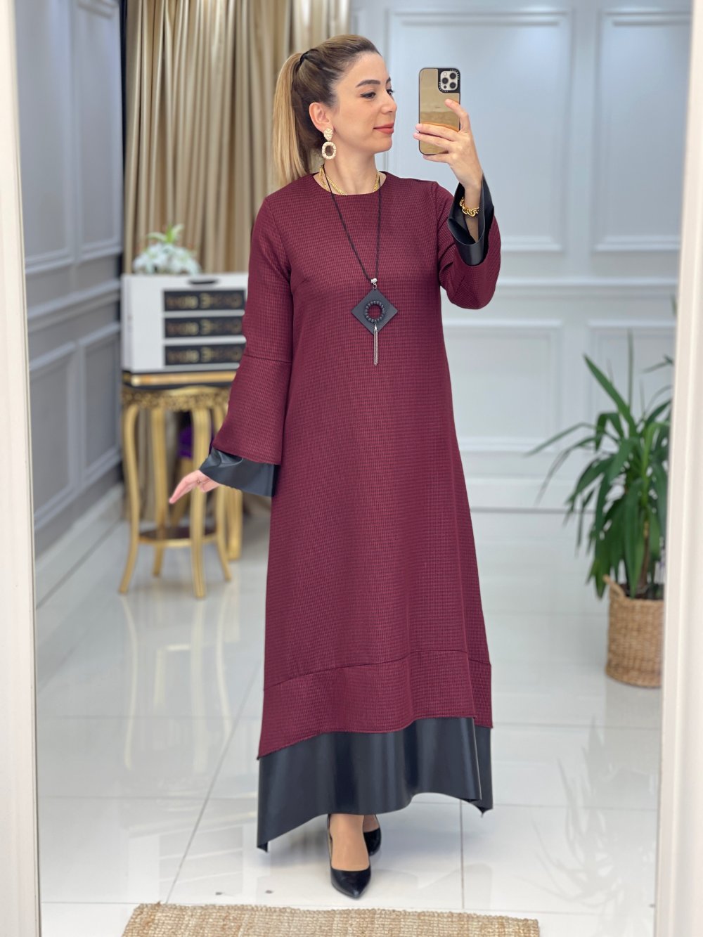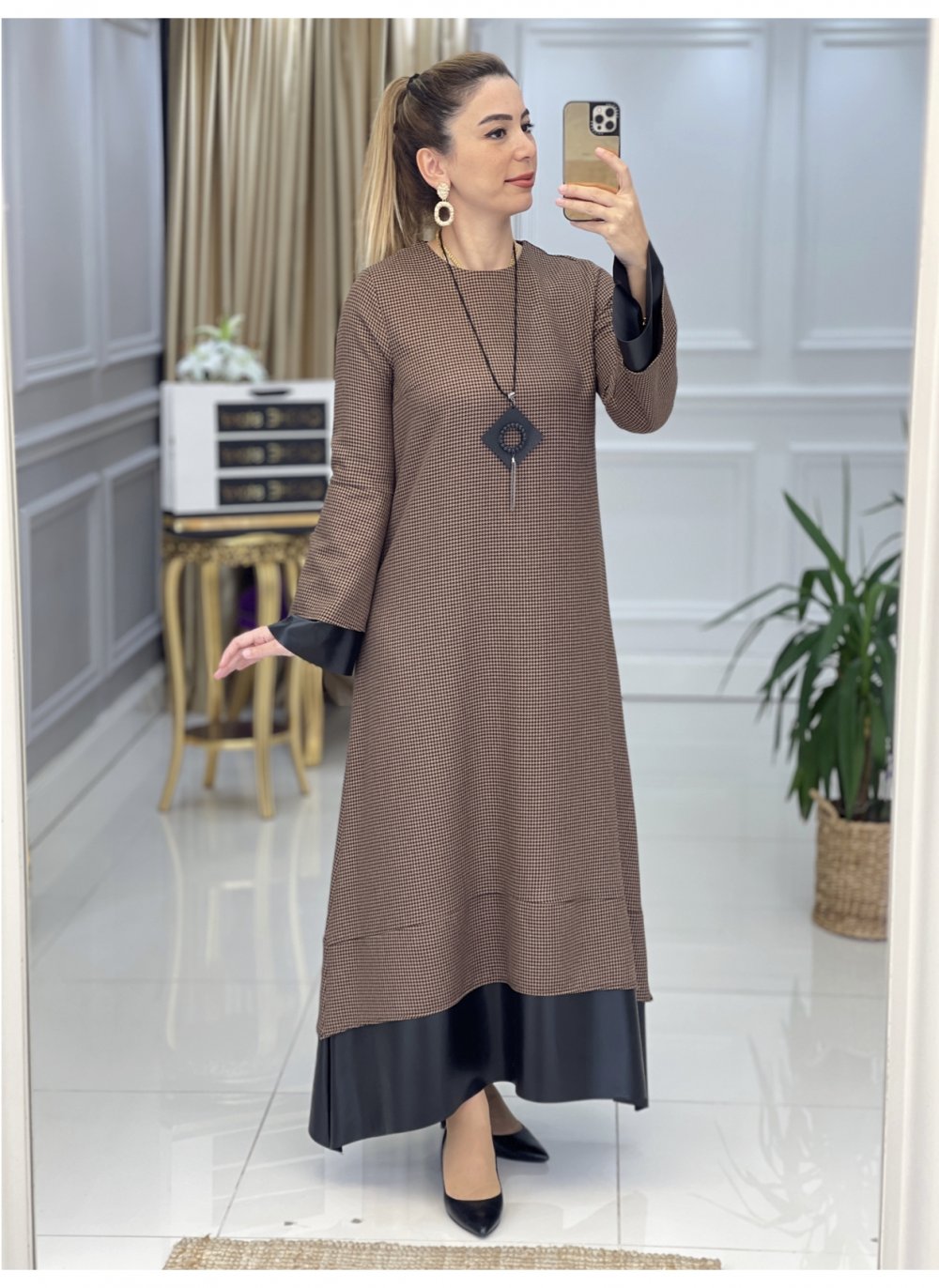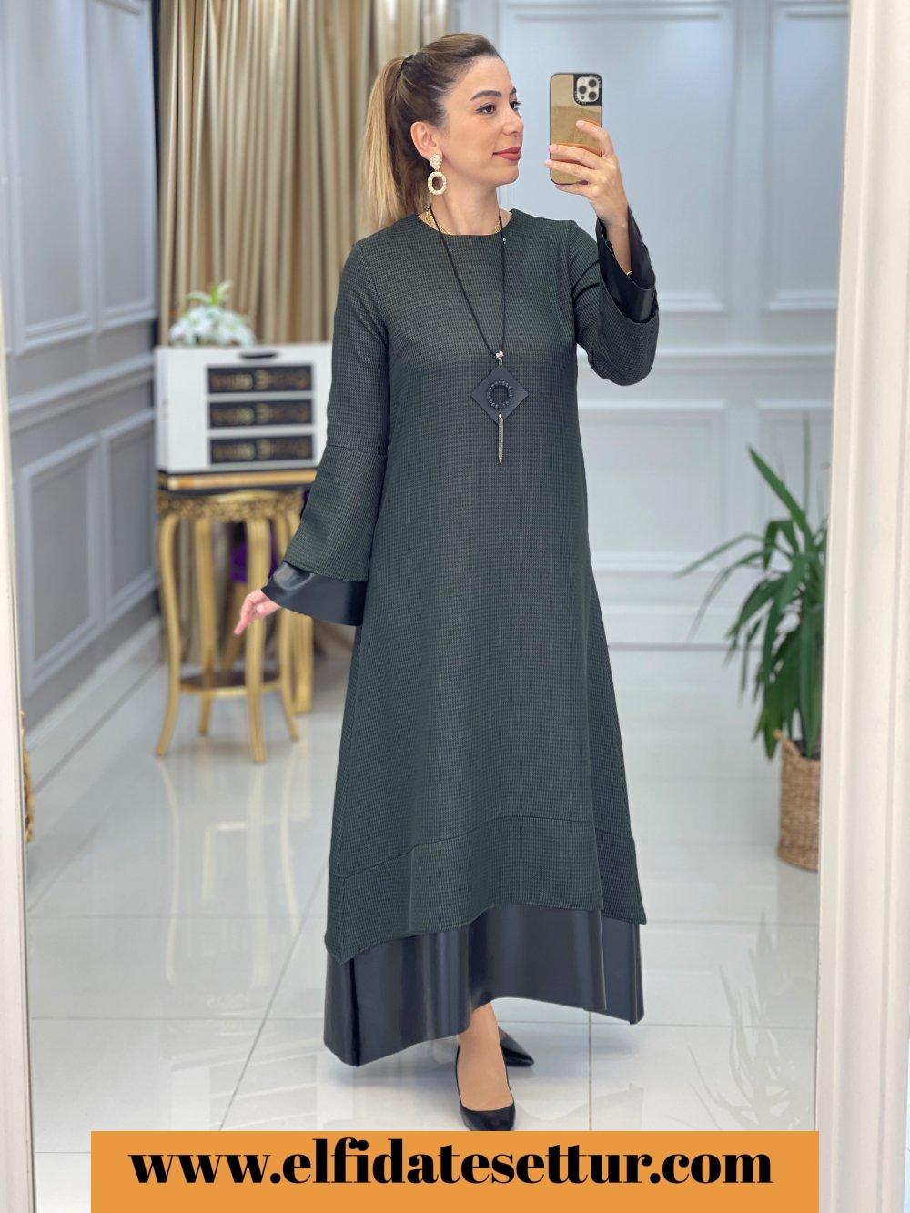 Ürün bilgileri: 1. Sınıf Yünefekt Kumaştır. Kol Uçları Ve Etek Uçları Deri Kumaştır. Elbise kazayağı Desenlidir. Kolye hediyedir. Elbise boy: 140 cm